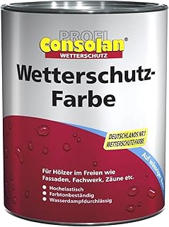 Die mit Consolan Wetterschutz-Farbe gestrichenen Objekte bildeten eine homogene Schicht, deren Filmeigenschaften auch nach langjähriger Bewitterung nur sehr geringe Abnutzungserscheinungen aufwiesen und somit dauerhaft intakt waren. Das Ergebnis: Renovierungsintervalle von mehr als 10 Jahren sind möglich. Zertifiziert nach DIN EN 927-2. Consolan Profi Wetterschutzfarbe Holzschutz außen 2,5 Liter, Gelb, 2.5 l (1er Pack) 48,09 € Consolan Profi Wetterschutzfarbe RM 205 dunkelbraun 2,5 Liter 48,99 €; Consolan Profi Wetterschutzfarbe Holzschutz außen 2,5 Liter, Schwarz, 2.5 l (1er Pack) 51,18 € Consolan Profi Wetterschutzfarbe Weiss 2,5L Pro 51,62 €; 2,5L Wetterschutzfarbe rotbraun Ausführung: - Rotbraun - Profi