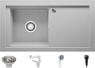 Granitspüle Grau 89 x 49,5 cm, Spülbecken + Siphon Automatisch, Küchenspüle ab 60er Unterschrank in 5 Farben mit Siphon und Antibakterielle Varianten, Einbauspüle von Primagran